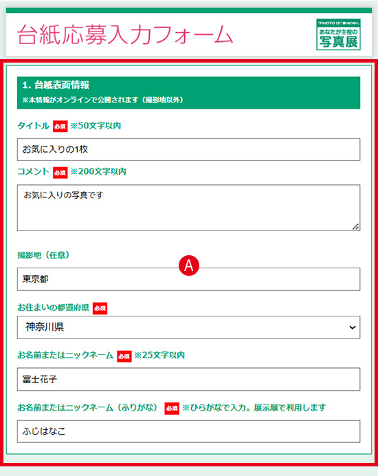「タイトル」「この作品に込めた気持ち・メッセージ」「お住まいの都道府県」「お名前またはニックネーム」など、必須事項をご入力ください。